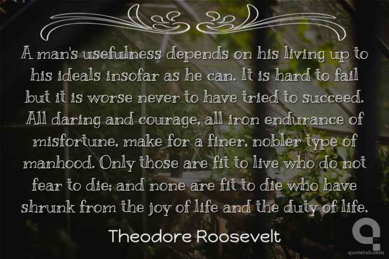 A man's usefulness depends on his living up to his ideals insofar as he can. It is hard to fail but it is worse never to have tried to succeed. All daring and courage, all iron endurance of misfortune, make for a finer, nobler type of manhood. Only those are fit to live who do not fear to die; and none are fit to die who have shrunk from the joy of life and the duty of life.