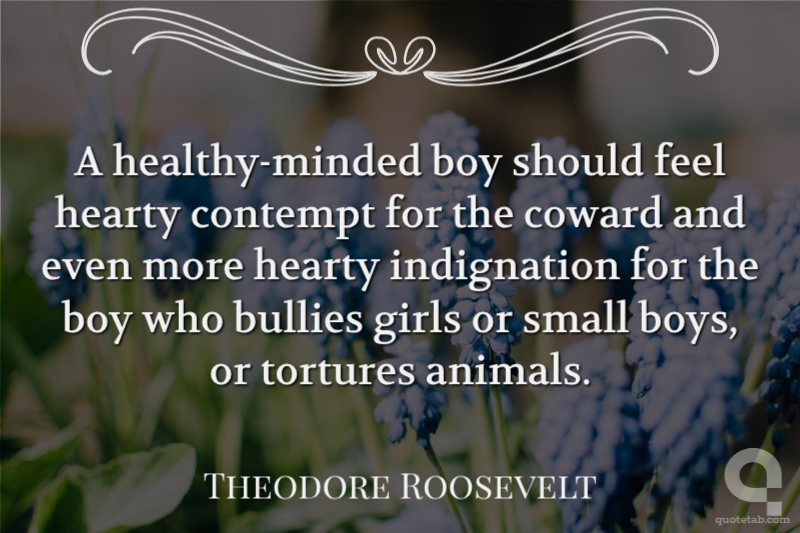 A healthy-minded boy should feel hearty contempt for the coward and even more hearty indignation for the boy who bullies girls or small boys, or tortures animals.