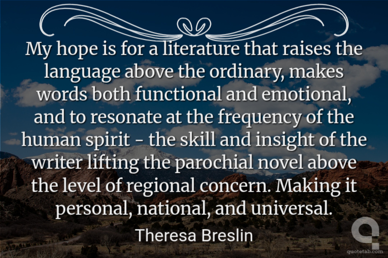 My hope is for a literature that raises the language above the ordinary, makes words both functional and emotional, and to resonate at the frequency of the human spirit - the skill and insight of the writer lifting the parochial novel above the level of regional concern. Making it personal, national, and universal.