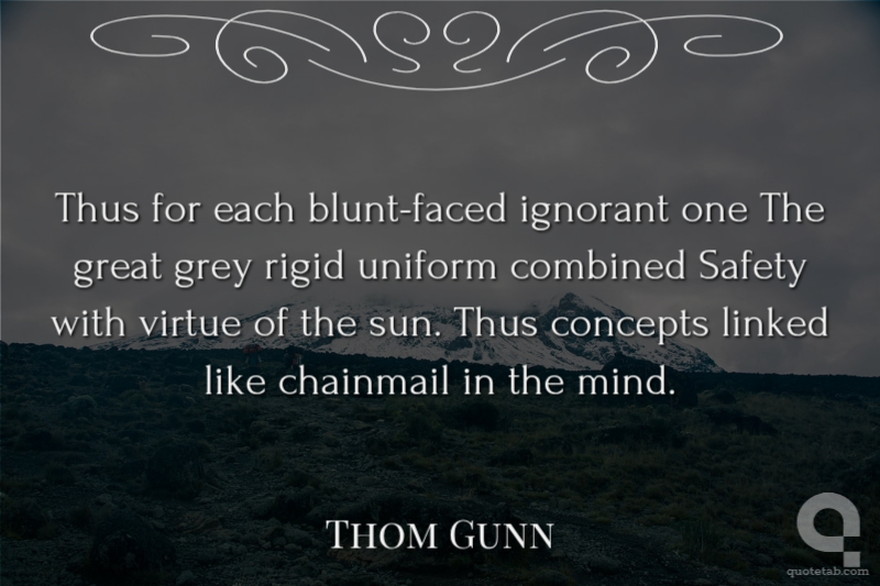 Thus for each blunt-faced ignorant one The great grey rigid uniform combined Safety with virtue of the sun. Thus concepts linked like chainmail in the mind.