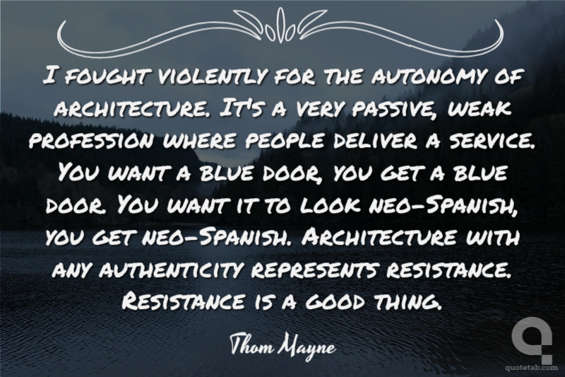 I fought violently for the autonomy of architecture. It's a very passive, weak profession where people deliver a service. You want a blue door, you get a blue door. You want it to look neo-Spanish, you get neo-Spanish. Architecture with any authenticity represents resistance. Resistance is a good thing.
