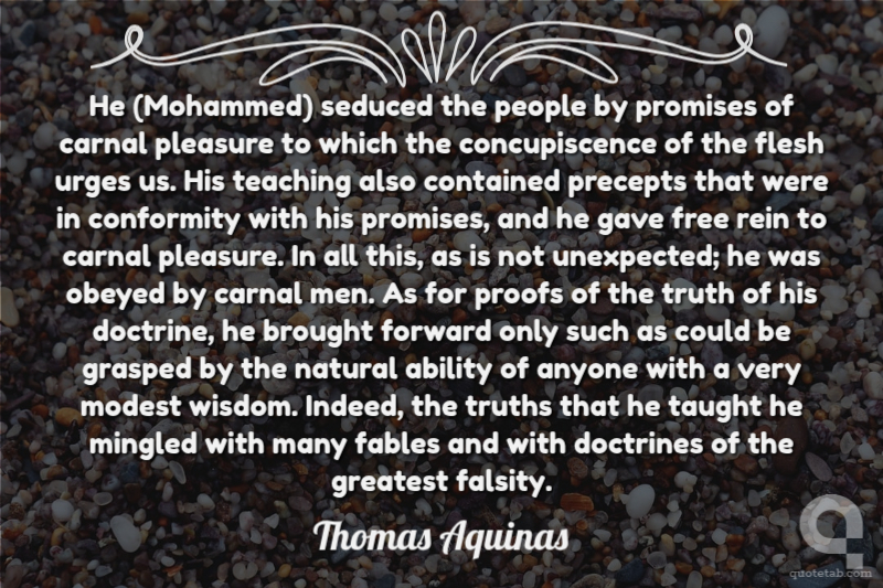 He (Mohammed) seduced the people by promises of carnal pleasure to which the concupiscence of the flesh urges us. His teaching also contained precepts that were in conformity with his promises, and he gave free rein to carnal pleasure. In all this, as is not unexpected; he was obeyed by carnal men. As for proofs of the truth of his doctrine, he brought forward only such as could be grasped by the natural ability of anyone with a very modest wisdom. Indeed, the truths that he taught he mingled with many fables and with doctrines of the greatest falsity.