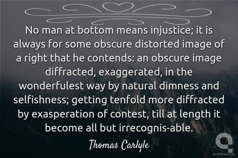 No man at bottom means injustice; it is always for some obscure distorted image of a right that he contends: an obscure image diffracted, exaggerated, in the wonderfulest way by natural dimness and selfishness; getting tenfold more diffracted by exasperation of contest, till at length it become all but irrecognis-able.