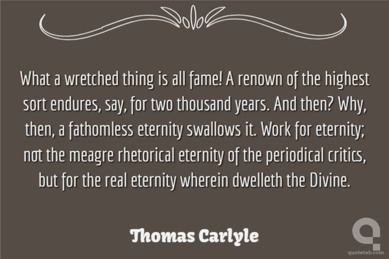 What a wretched thing is all fame! A renown of the highest sort endures, say, for two thousand years. And then? Why, then, a fathomless eternity swallows it. Work for eternity; not the meagre rhetorical eternity of the periodical critics, but for the real eternity wherein dwelleth the Divine.