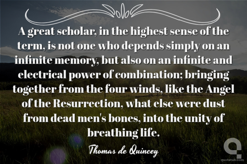 A great scholar, in the highest sense of the term, is not one who depends simply on an infinite memory, but also on an infinite and electrical power of combination; bringing together from the four winds, like the Angel of the Resurrection, what else were dust from dead men's bones, into the unity of breathing life.