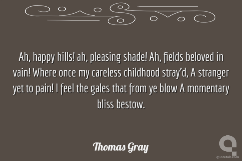 Ah, happy hills! ah, pleasing shade! Ah, fields beloved in vain! Where once my careless childhood stray'd, A stranger yet to pain! I feel the gales that from ye blow A momentary bliss bestow.