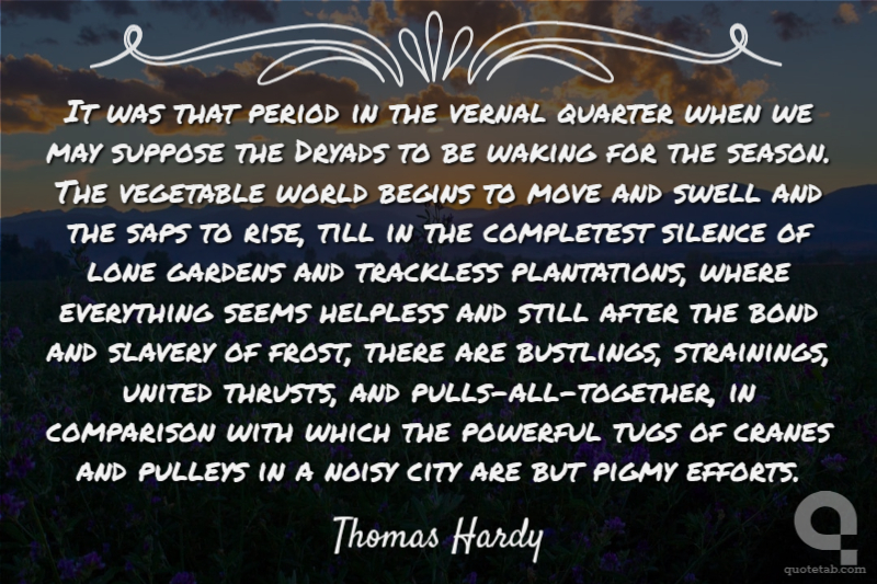 It was that period in the vernal quarter when we may suppose the Dryads to be waking for the season. The vegetable world begins to move and swell and the saps to rise, till in the completest silence of lone gardens and trackless plantations, where everything seems helpless and still after the bond and slavery of frost, there are bustlings, strainings, united thrusts, and pulls-all-together, in comparison with which the powerful tugs of cranes and pulleys in a noisy city are but pigmy efforts.