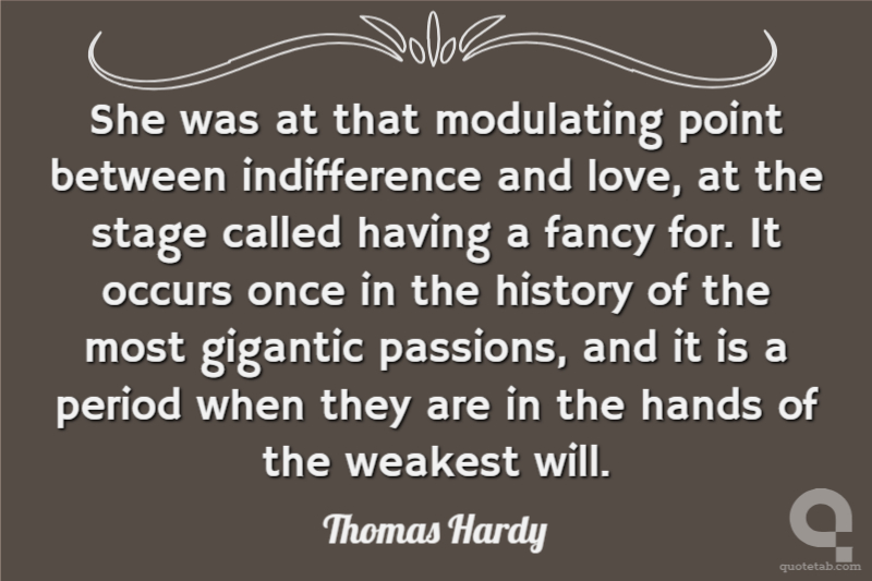 She was at that modulating point between indifference and love, at the stage called having a fancy for. It occurs once in the history of the most gigantic passions, and it is a period when they are in the hands of the weakest will.