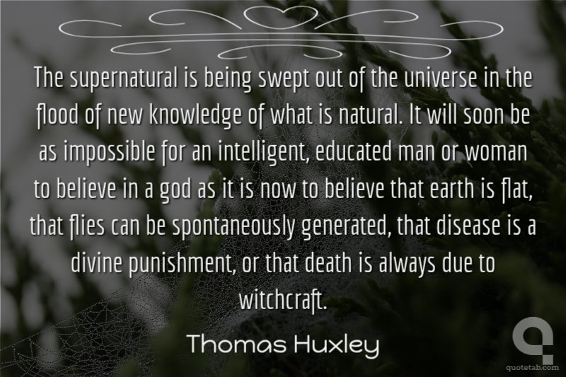 The supernatural is being swept out of the universe in the flood of new knowledge of what is natural. It will soon be as impossible for an intelligent, educated man or woman to believe in a god as it is now to believe that earth is flat, that flies can be spontaneously generated, that disease is a divine punishment, or that death is always due to witchcraft.