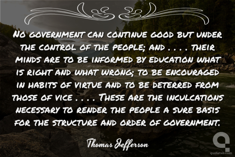 No government can continue good but under the control of the people; and . . . . their minds are to be informed by education what is right and what wrong; to be encouraged in habits of virtue and to be deterred from those of vice . . . . These are the inculcations necessary to render the people a sure basis for the structure and order of government.