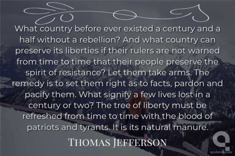 What country before ever existed a century and a half without a rebellion? And what country can preserve its liberties if their rulers are not warned from time to time that their people preserve the spirit of resistance? Let them take arms. The remedy is to set them right as to facts, pardon and pacify them. What signify a few lives lost in a century or two? The tree of liberty must be refreshed from time to time with the blood of patriots and tyrants. It is its natural manure.