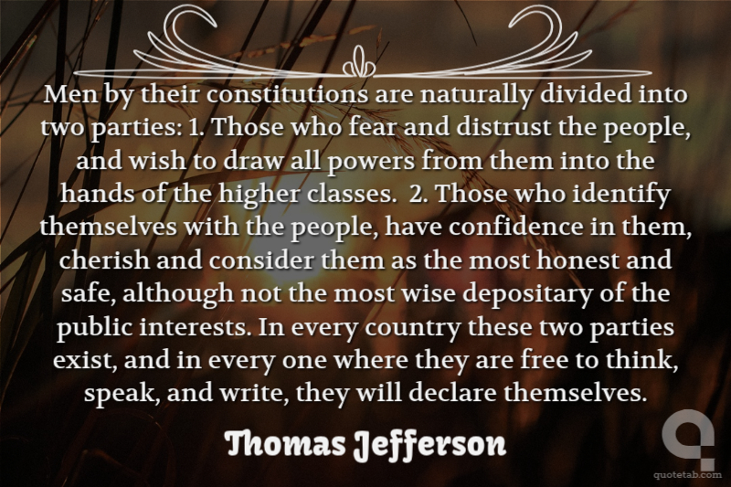 Men by their constitutions are naturally divided into two parties: 1. Those who fear and distrust the people, and wish to draw all powers from them into the hands of the higher classes. 2. Those who identify themselves with the people, have confidence in them, cherish and consider them as the most honest and safe, although not the most wise depositary of the public interests. In every country these two parties exist, and in every one where they are free to think, speak, and write, they will declare themselves.