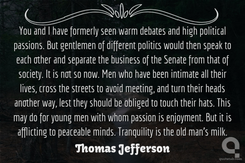 You and I have formerly seen warm debates and high political passions. But gentlemen of different politics would then speak to each other and separate the business of the Senate from that of society. It is not so now. Men who have been intimate all their lives, cross the streets to avoid meeting, and turn their heads another way, lest they should be obliged to touch their hats. This may do for young men with whom passion is enjoyment. But it is afflicting to peaceable minds. Tranquility is the old man's milk.