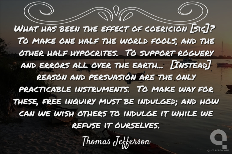 What has been the effect of coericion [sic]? To make one half the world fools, and the other half hypocrites. To support roguery and errors all over the earth... [Instead] reason and persuasion are the only practicable instruments. To make way for these, free inquiry must be indulged; and how can we wish others to indulge it while we refuse it ourselves.