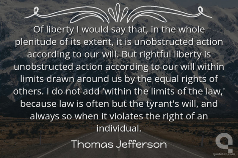 Of liberty I would say that, in the whole plenitude of its extent, it is unobstructed action according to our will. But rightful liberty is unobstructed action according to our will within limits drawn around us by the equal rights of others. I do not add 'within the limits of the law,' because law is often but the tyrant's will, and always so when it violates the right of an individual.