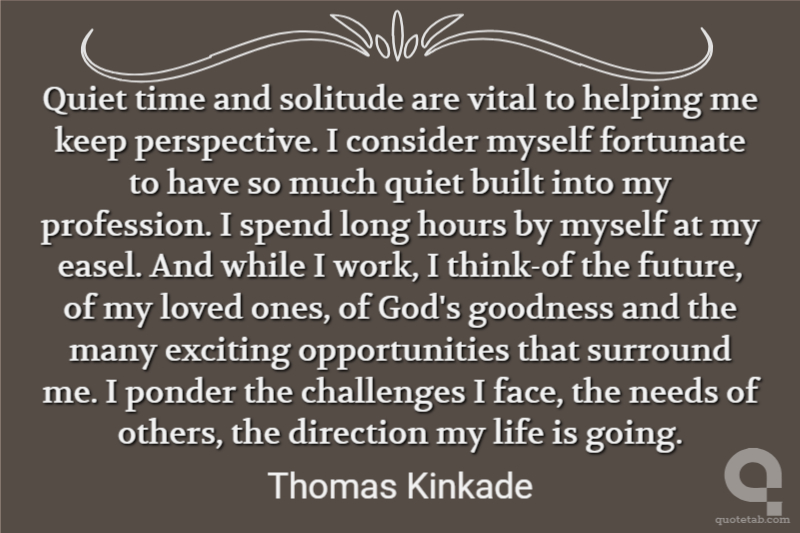 Quiet time and solitude are vital to helping me keep perspective. I consider myself fortunate to have so much quiet built into my profession. I spend long hours by myself at my easel. And while I work, I think-of the future, of my loved ones, of God's goodness and the many exciting opportunities that surround me. I ponder the challenges I face, the needs of others, the direction my life is going.