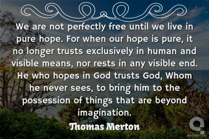 We are not perfectly free until we live in pure hope. For when our hope is pure, it no longer trusts exclusively in human and visible means, nor rests in any visible end. He who hopes in God trusts God, Whom he never sees, to bring him to the possession of things that are beyond imagination.