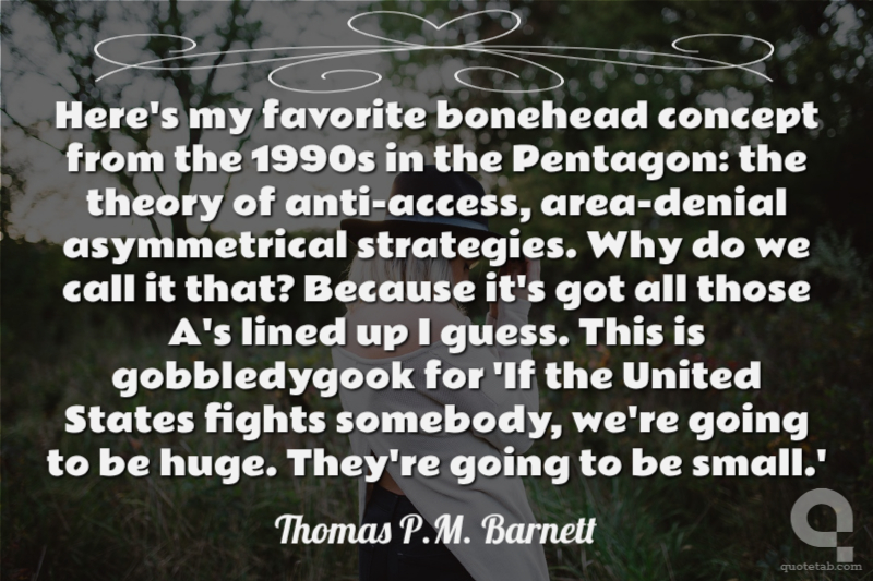Here's my favorite bonehead concept from the 1990s in the Pentagon: the theory of anti-access, area-denial asymmetrical strategies. Why do we call it that? Because it's got all those A's lined up I guess. This is gobbledygook for 'If the United States fights somebody, we're going to be huge. They're going to be small.'
