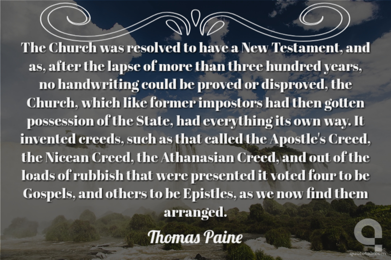The Church was resolved to have a New Testament, and as, after the lapse of more than three hundred years, no handwriting could be proved or disproved, the Church, which like former impostors had then gotten possession of the State, had everything its own way. It invented creeds, such as that called the Apostle's Creed, the Nicean Creed, the Athanasian Creed, and out of the loads of rubbish that were presented it voted four to be Gospels, and others to be Epistles, as we now find them arranged.