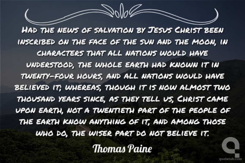 Had the news of salvation by Jesus Christ been inscribed on the face of the sun and the moon, in characters that all nations would have understood, the whole earth had known it in twenty-four hours, and all nations would have believed it; whereas, though it is now almost two thousand years since, as they tell us, Christ came upon earth, not a twentieth part of the people of the earth know anything of it, and among those who do, the wiser part do not believe it.