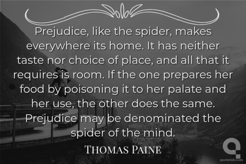 Prejudice, like the spider, makes everywhere its home. It has neither taste nor choice of place, and all that it requires is room. If the one prepares her food by poisoning it to her palate and her use, the other does the same. Prejudice may be denominated the spider of the mind.