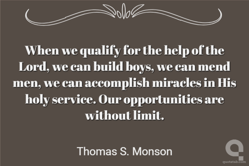 When we qualify for the help of the Lord, we can build boys, we can mend men, we can accomplish miracles in His holy service. Our opportunities are without limit.