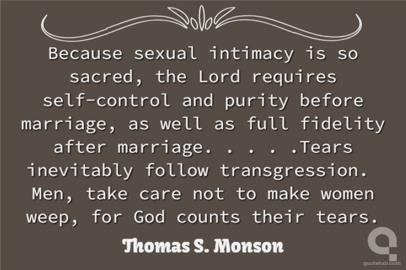 Because sexual intimacy is so sacred, the Lord requires self-control and purity before marriage, as well as full fidelity after marriage. . . . .Tears inevitably follow transgression. Men, take care not to make women weep, for God counts their tears.