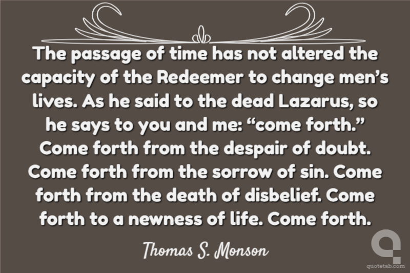 The passage of time has not altered the capacity of the Redeemer to change men’s lives. As he said to the dead Lazarus, so he says to you and me: “come forth.” Come forth from the despair of doubt. Come forth from the sorrow of sin. Come forth from the death of disbelief. Come forth to a newness of life. Come forth.