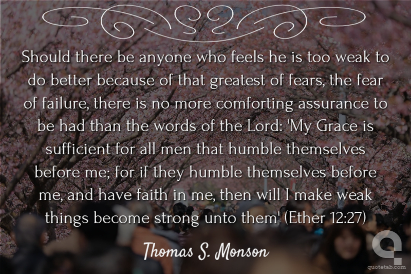 Should there be anyone who feels he is too weak to do better because of that greatest of fears, the fear of failure, there is no more comforting assurance to be had than the words of the Lord: 'My Grace is sufficient for all men that humble themselves before me; for if they humble themselves before me, and have faith in me, then will I make weak things become strong unto them' (Ether 12:27)