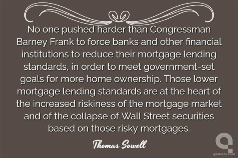 No one pushed harder than Congressman Barney Frank to force banks and other financial institutions to reduce their mortgage lending standards, in order to meet government-set goals for more home ownership. Those lower mortgage lending standards are at the heart of the increased riskiness of the mortgage market and of the collapse of Wall Street securities based on those risky mortgages.