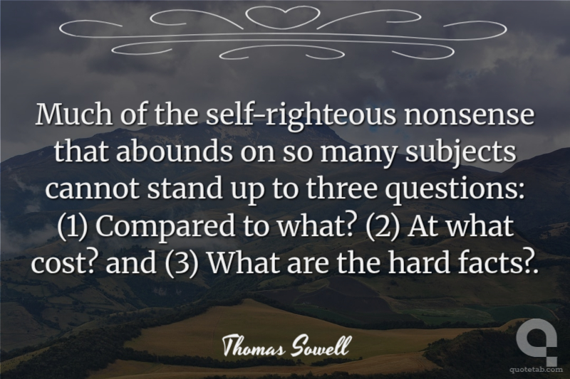 Much of the self-righteous nonsense that abounds on so many subjects cannot stand up to three questions: (1) Compared to what? (2) At what cost? and (3) What are the hard facts?.