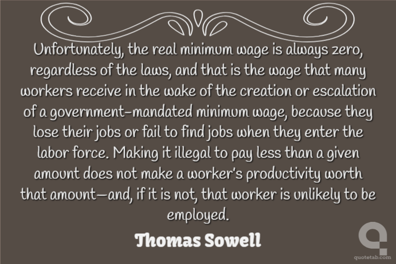 Unfortunately, the real minimum wage is always zero, regardless of the laws, and that is the wage that many workers receive in the wake of the creation or escalation of a government-mandated minimum wage, because they lose their jobs or fail to find jobs when they enter the labor force. Making it illegal to pay less than a given amount does not make a worker’s productivity worth that amount—and, if it is not, that worker is unlikely to be employed.