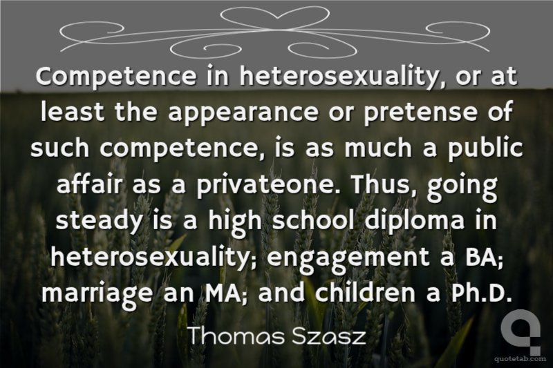 Competence in heterosexuality, or at least the appearance or pretense of such competence, is as much a public affair as a privateone. Thus, going steady is a high school diploma in heterosexuality; engagement a BA; marriage an MA; and children a Ph.D.