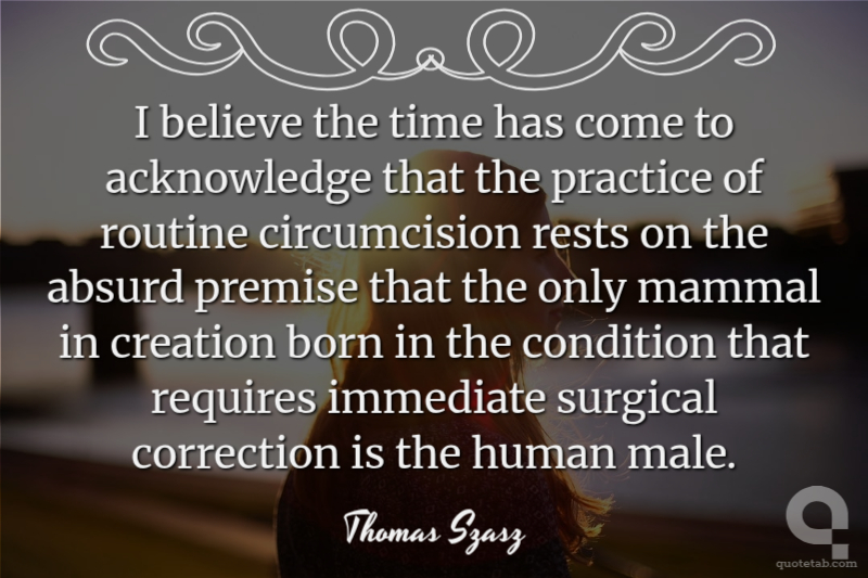 I believe the time has come to acknowledge that the practice of routine circumcision rests on the absurd premise that the only mammal in creation born in the condition that requires immediate surgical correction is the human male.