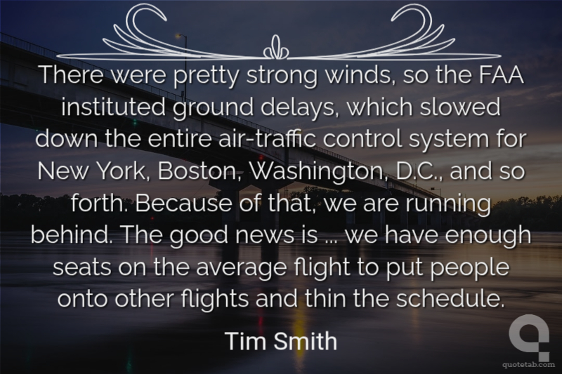There were pretty strong winds, so the FAA instituted ground delays, which slowed down the entire air-traffic control system for New York, Boston, Washington, D.C., and so forth. Because of that, we are running behind. The good news is ... we have enough seats on the average flight to put people onto other flights and thin the schedule.