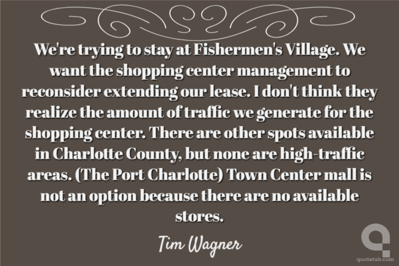 We're trying to stay at Fishermen's Village. We want the shopping center management to reconsider extending our lease. I don't think they realize the amount of traffic we generate for the shopping center. There are other spots available in Charlotte County, but none are high-traffic areas. (The Port Charlotte) Town Center mall is not an option because there are no available stores.
