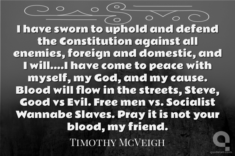 I have sworn to uphold and defend the Constitution against all enemies, foreign and domestic, and I will....I have come to peace with myself, my God, and my cause. Blood will flow in the streets, Steve, Good vs Evil. Free men vs. Socialist Wannabe Slaves. Pray it is not your blood, my friend.