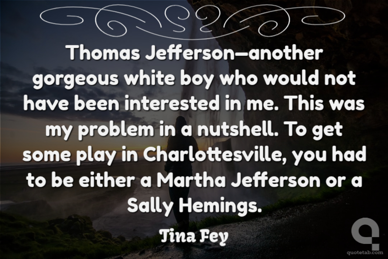 Thomas Jefferson—another gorgeous white boy who would not have been interested in me. This was my problem in a nutshell. To get some play in Charlottesville, you had to be either a Martha Jefferson or a Sally Hemings.