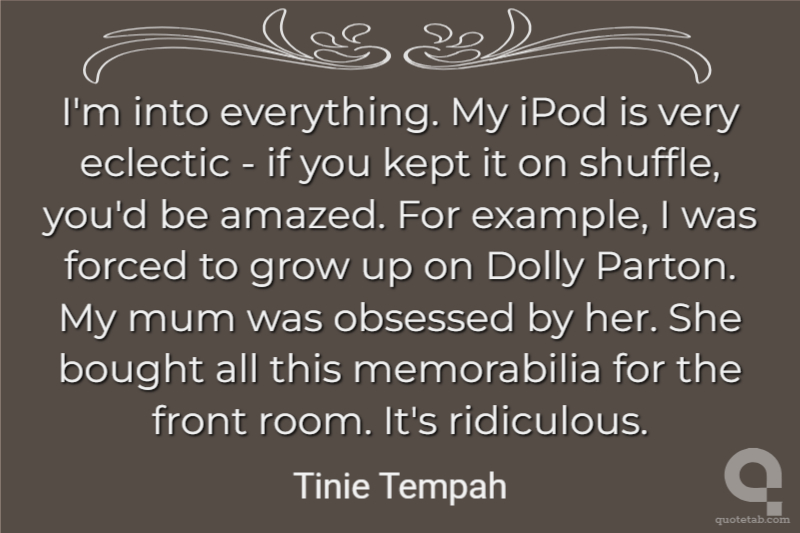 I'm into everything. My iPod is very eclectic - if you kept it on shuffle, you'd be amazed. For example, I was forced to grow up on Dolly Parton. My mum was obsessed by her. She bought all this memorabilia for the front room. It's ridiculous.