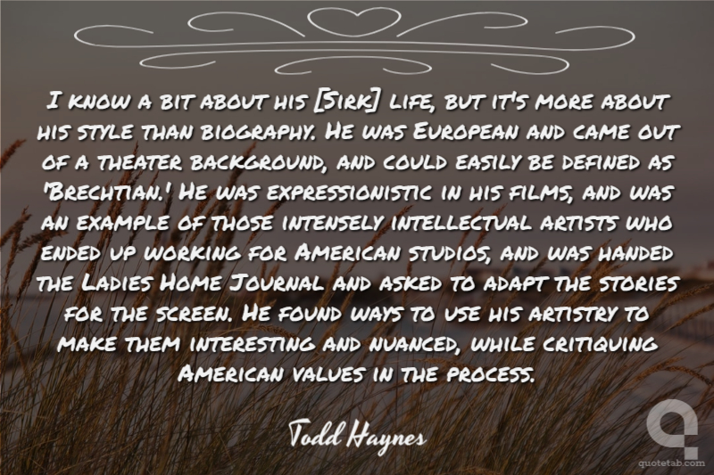 I know a bit about his [Sirk] life, but it's more about his style than biography. He was European and came out of a theater background, and could easily be defined as 'Brechtian.' He was expressionistic in his films, and was an example of those intensely intellectual artists who ended up working for American studios, and was handed the Ladies Home Journal and asked to adapt the stories for the screen. He found ways to use his artistry to make them interesting and nuanced, while critiquing American values in the process.