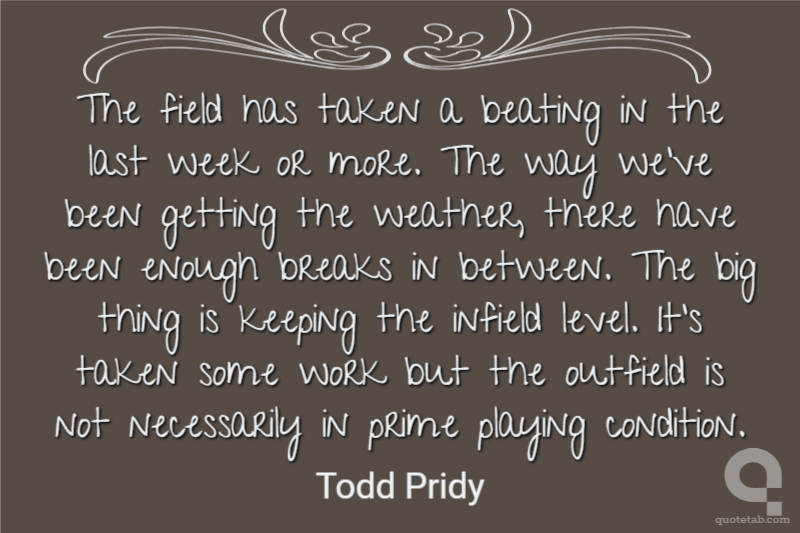 The field has taken a beating in the last week or more. The way we've been getting the weather, there have been enough breaks in between. The big thing is keeping the infield level. It's taken some work but the outfield is not necessarily in prime playing condition.