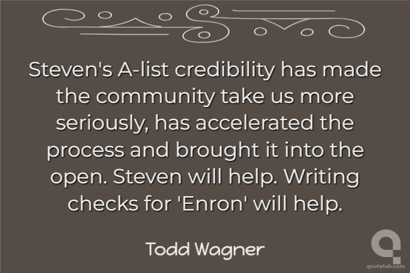 Steven's A-list credibility has made the community take us more seriously, has accelerated the process and brought it into the open. Steven will help. Writing checks for 'Enron' will help.