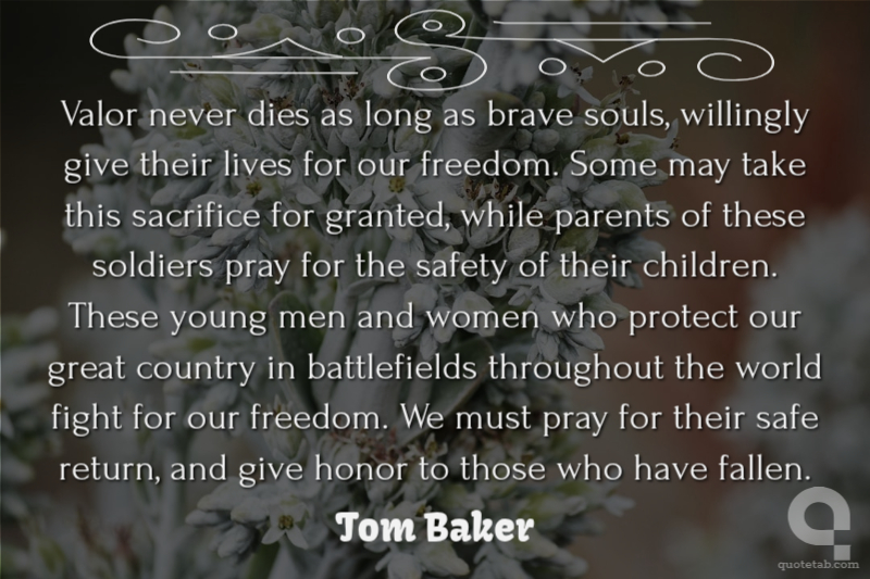 Valor never dies as long as brave souls, willingly give their lives for our freedom. Some may take this sacrifice for granted, while parents of these soldiers pray for the safety of their children. These young men and women who protect our great country in battlefields throughout the world fight for our freedom. We must pray for their safe return, and give honor to those who have fallen.