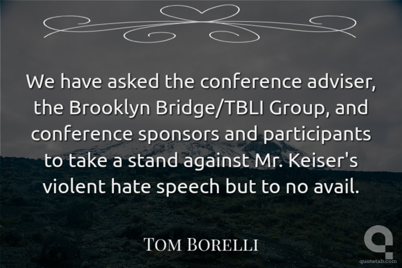 We have asked the conference adviser, the Brooklyn Bridge/TBLI Group, and conference sponsors and participants to take a stand against Mr. Keiser's violent hate speech but to no avail.