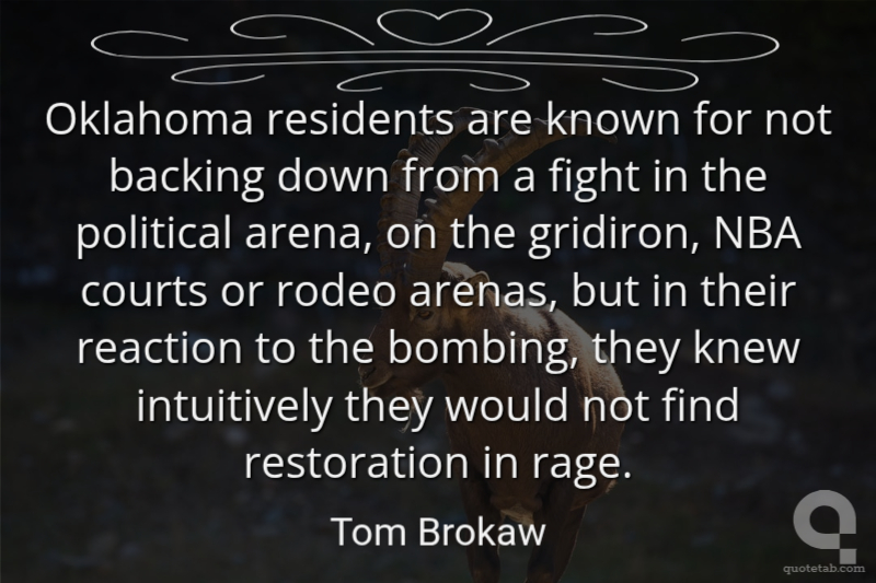 Oklahoma residents are known for not backing down from a fight in the political arena, on the gridiron, NBA courts or rodeo arenas, but in their reaction to the bombing, they knew intuitively they would not find restoration in rage.