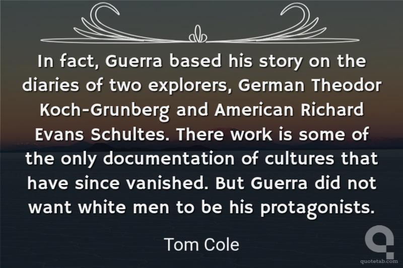 In fact, Guerra based his story on the diaries of two explorers, German Theodor Koch-Grunberg and American Richard Evans Schultes. There work is some of the only documentation of cultures that have since vanished. But Guerra did not want white men to be his protagonists.