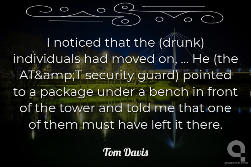 I noticed that the (drunk) individuals had moved on, ... He (the AT&T security guard) pointed to a package under a bench in front of the tower and told me that one of them must have left it there.