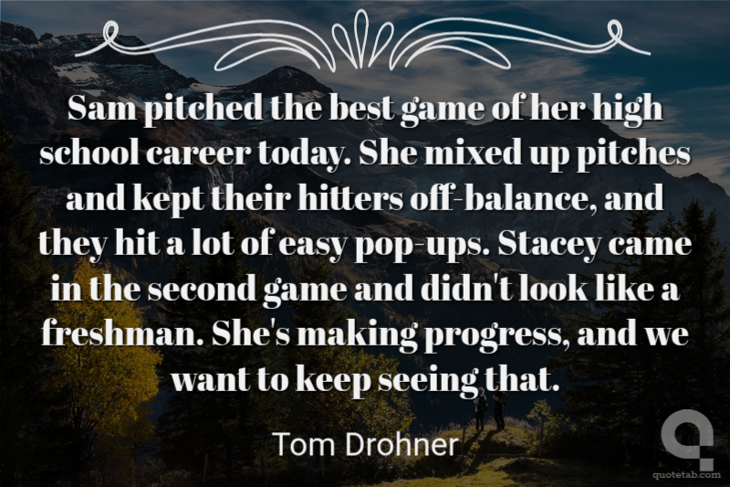 Sam pitched the best game of her high school career today. She mixed up pitches and kept their hitters off-balance, and they hit a lot of easy pop-ups. Stacey came in the second game and didn't look like a freshman. She's making progress, and we want to keep seeing that.