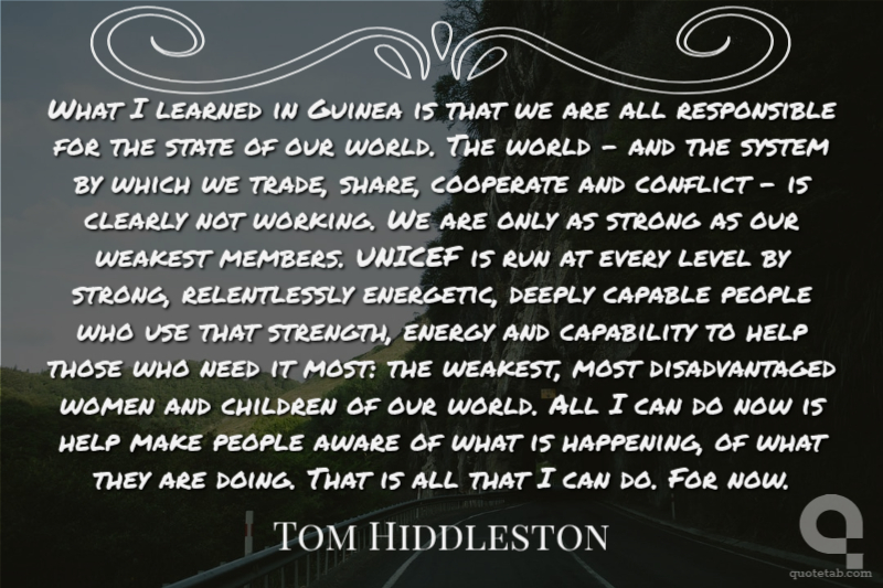 What I learned in Guinea is that we are all responsible for the state of our world. The world - and the system by which we trade, share, cooperate and conflict - is clearly not working. We are only as strong as our weakest members. UNICEF is run at every level by strong, relentlessly energetic, deeply capable people who use that strength, energy and capability to help those who need it most: the weakest, most disadvantaged women and children of our world. All I can do now is help make people aware of what is happening, of what they are doing. That is all that I can do. For now.