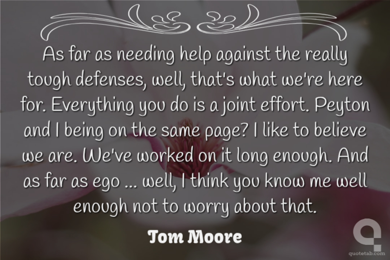 As far as needing help against the really tough defenses, well, that's what we're here for. Everything you do is a joint effort. Peyton and I being on the same page? I like to believe we are. We've worked on it long enough. And as far as ego ... well, I think you know me well enough not to worry about that.